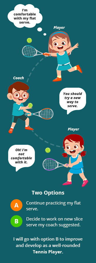 (b) decide to work on the new slice serve her coach suggested. Which option would the open-minded, coachable athlete choose?