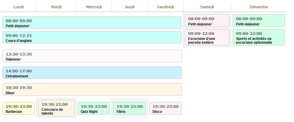 L’agenda ci-dessous représente une semaine typique qui inclut les entraînements et les activités de divertissement quotidiens et les excursions de week-end :